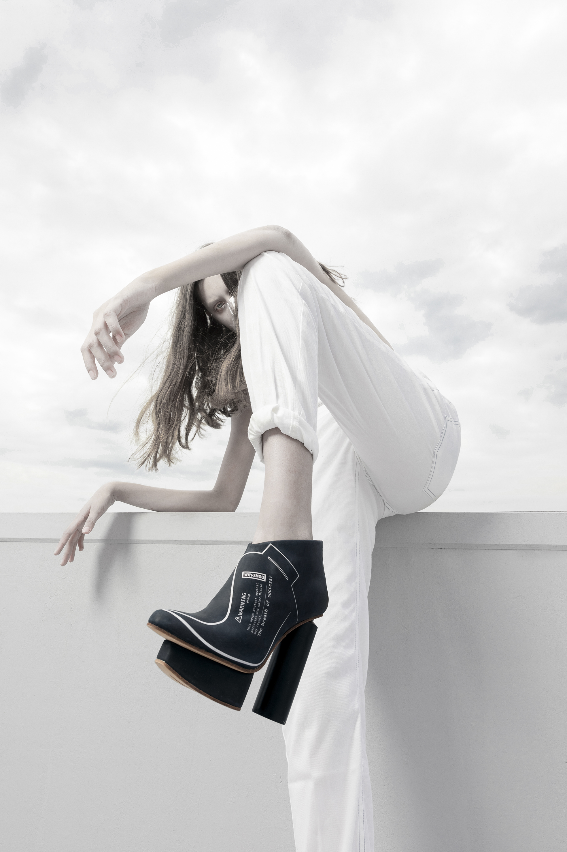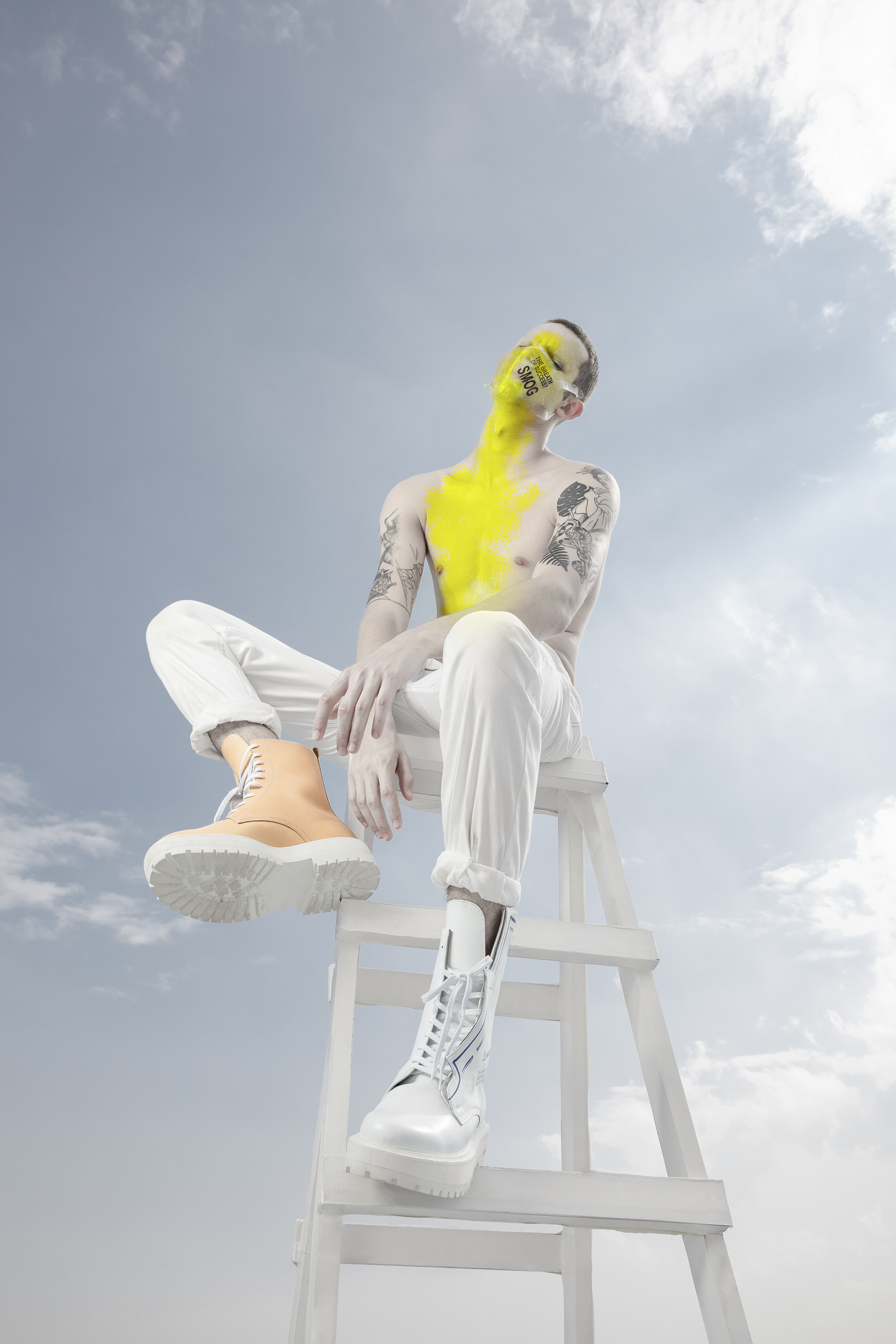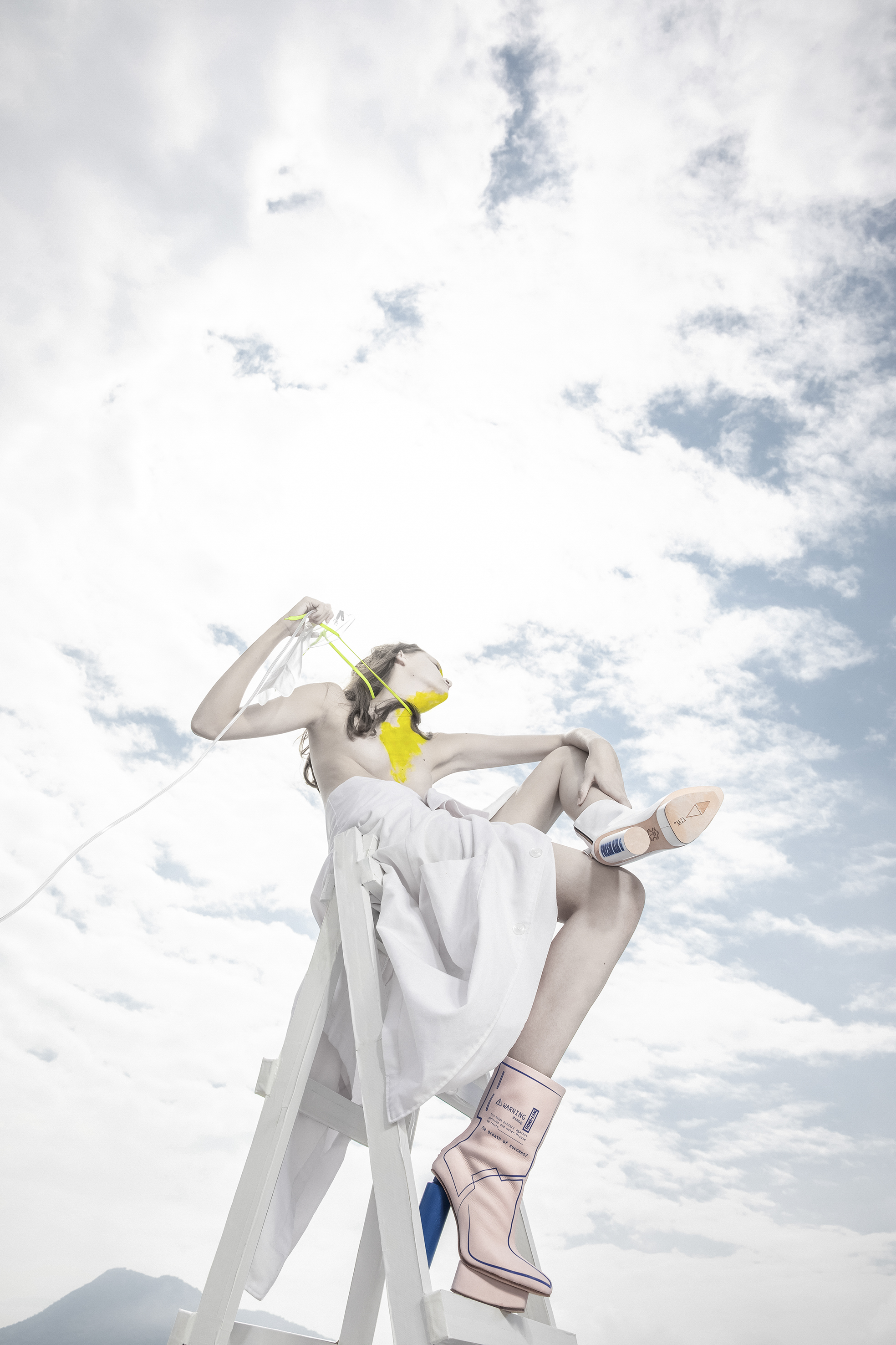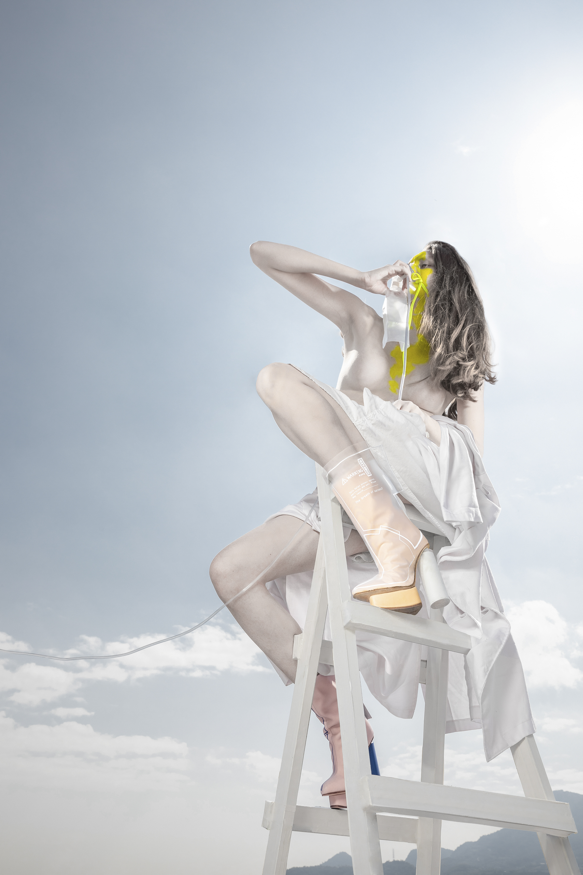 The design concept incorporates raincoats/masks signifies the need for protection against air pollution, representing the daily necessity of face masks in polluted environments. The material used, PEVA, serves as a representation of the environment engulfed in smog, emphasizing the urgency of the situation. Additionally, the inclusion of an oxygen cylinder as the heel completes the design, symbolizing the importance of clean air for our well-being. By integrating these elements, the concept aims to prompt reflection on the relationship between economic development and air pollution.