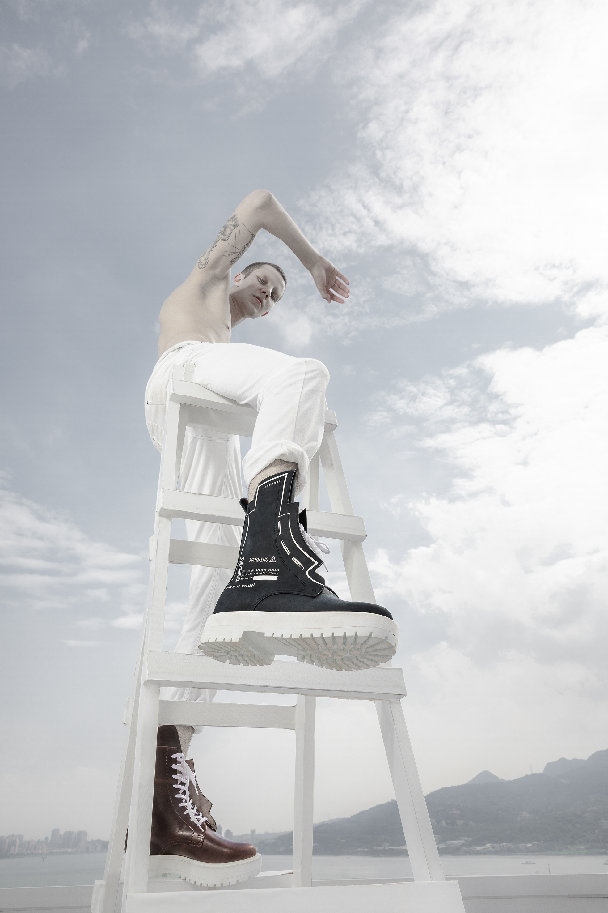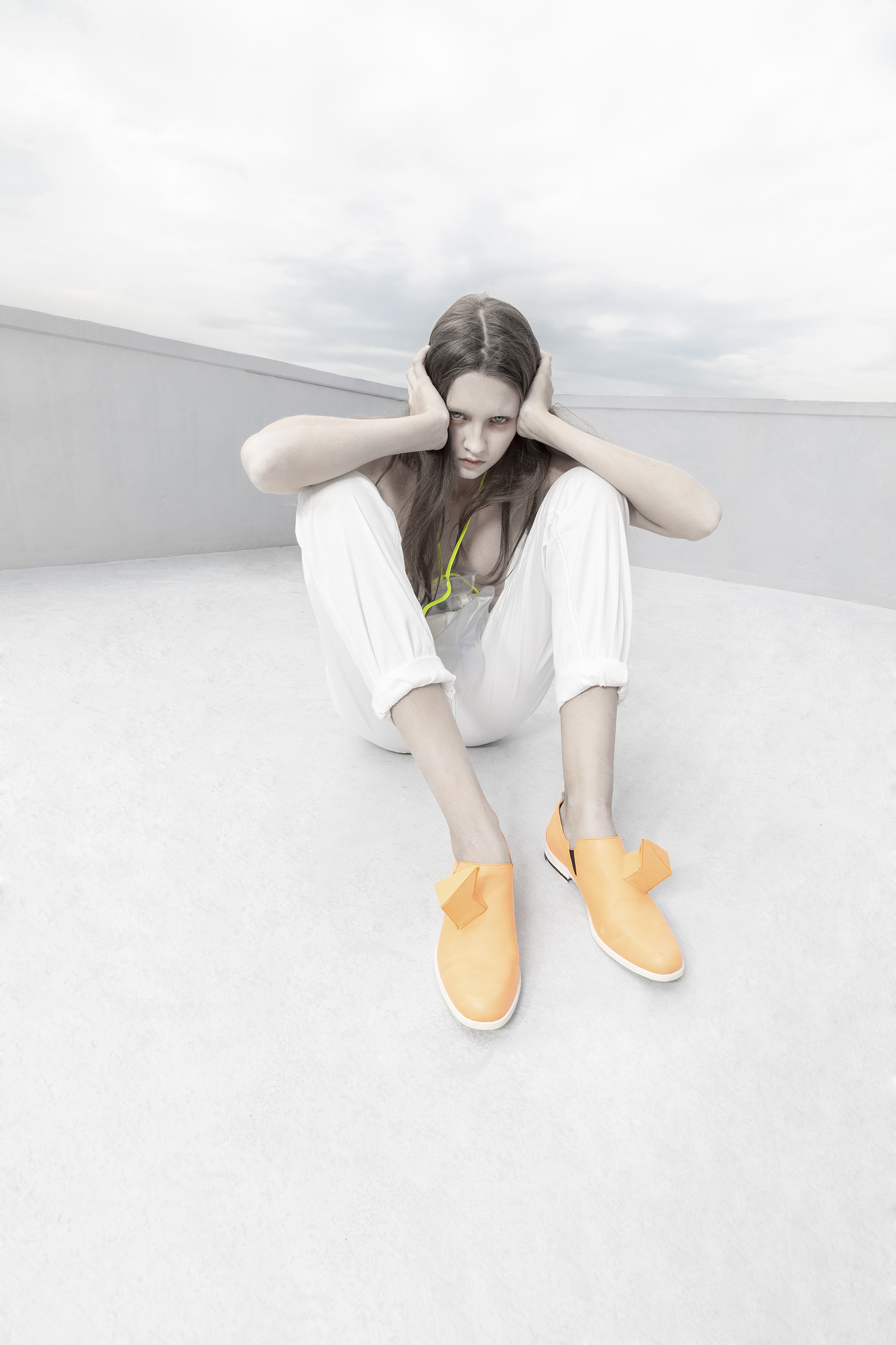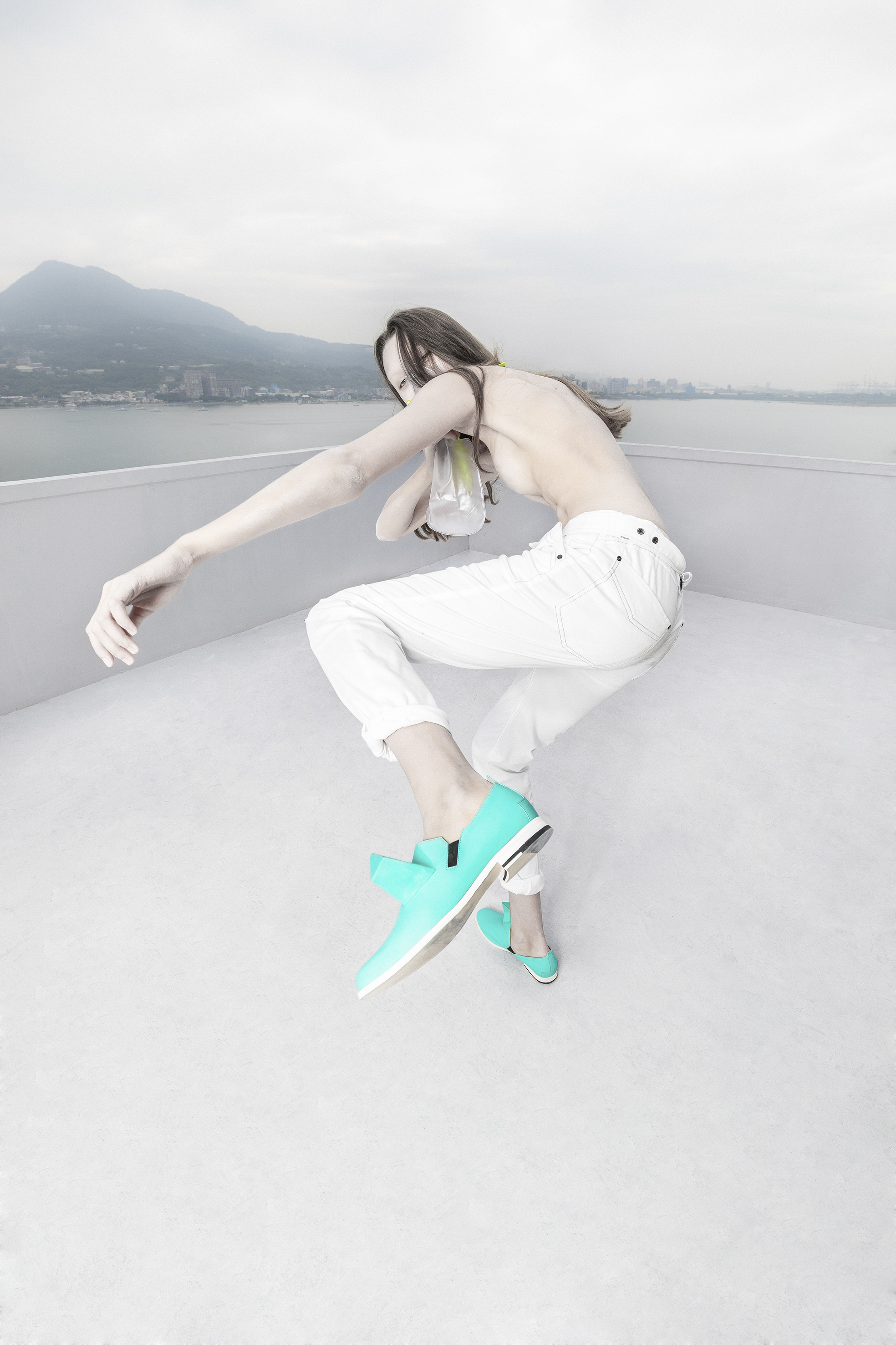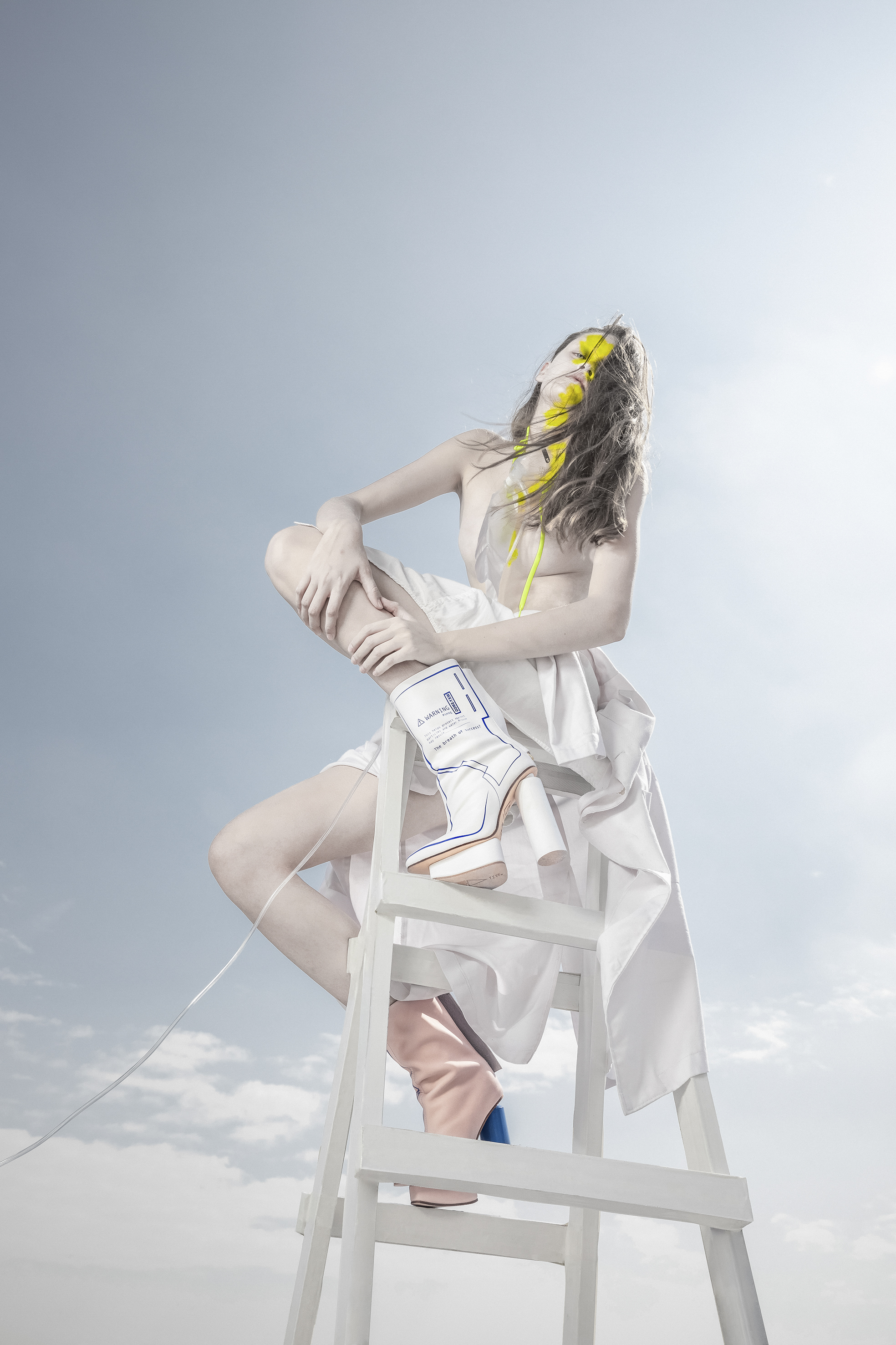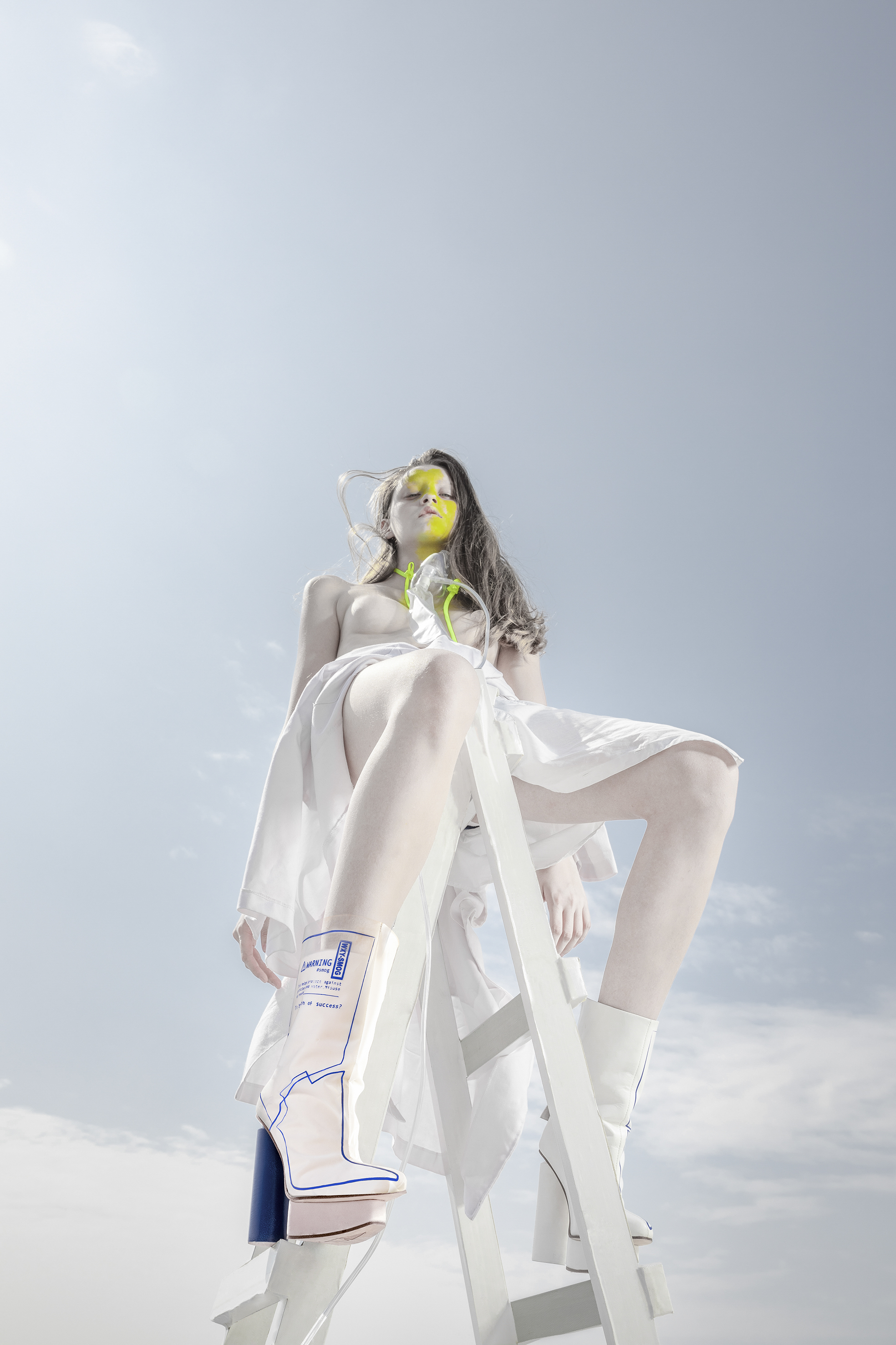 The design concept incorporates raincoats/masks signifies the need for protection against air pollution, representing the daily necessity of face masks in polluted environments. The material used, PEVA, serves as a representation of the environment engulfed in smog, emphasizing the urgency of the situation. Additionally, the inclusion of an oxygen cylinder as the heel completes the design, symbolizing the importance of clean air for our well-being. By integrating these elements, the concept aims to prompt reflection on the relationship between economic development and air pollution.